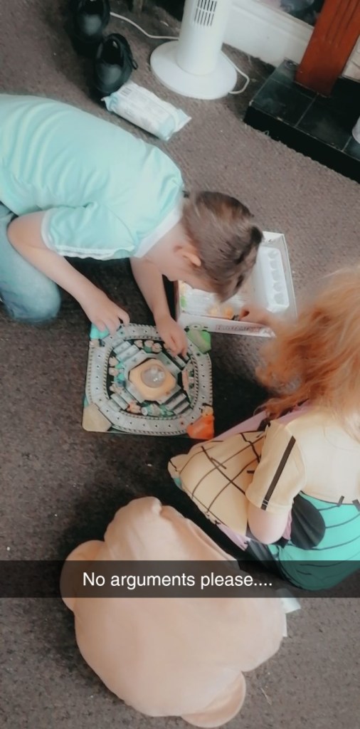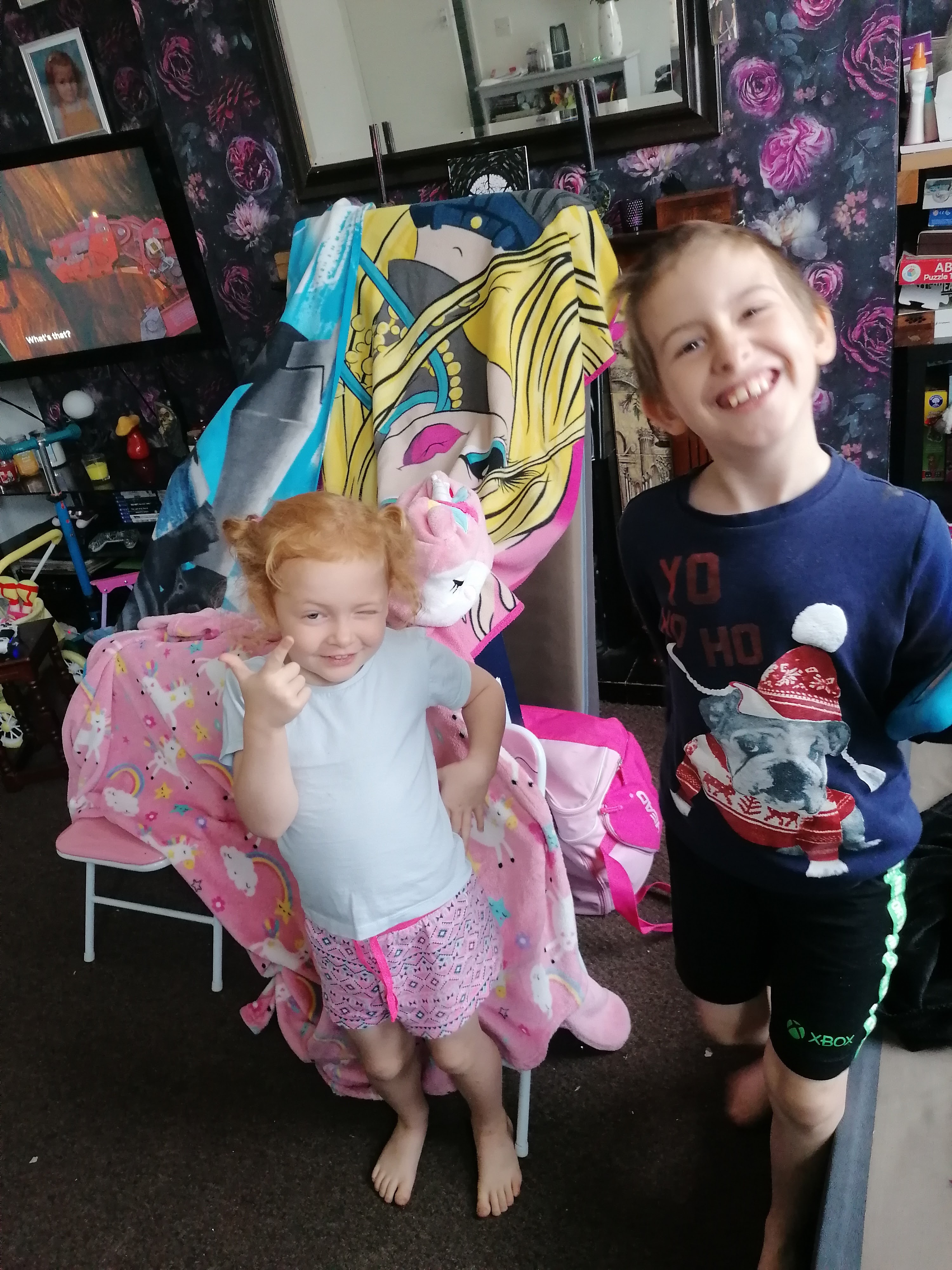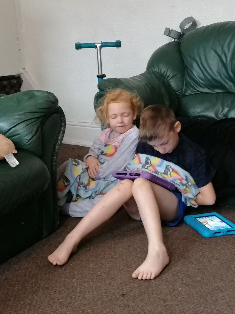 The kids playing cuddled up together. Pandora in her sally dress, went through a phase of loving Nightmare before christmas, she loves to dress up.