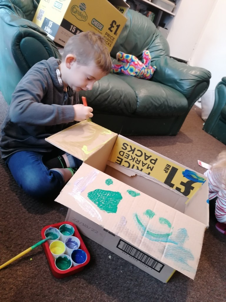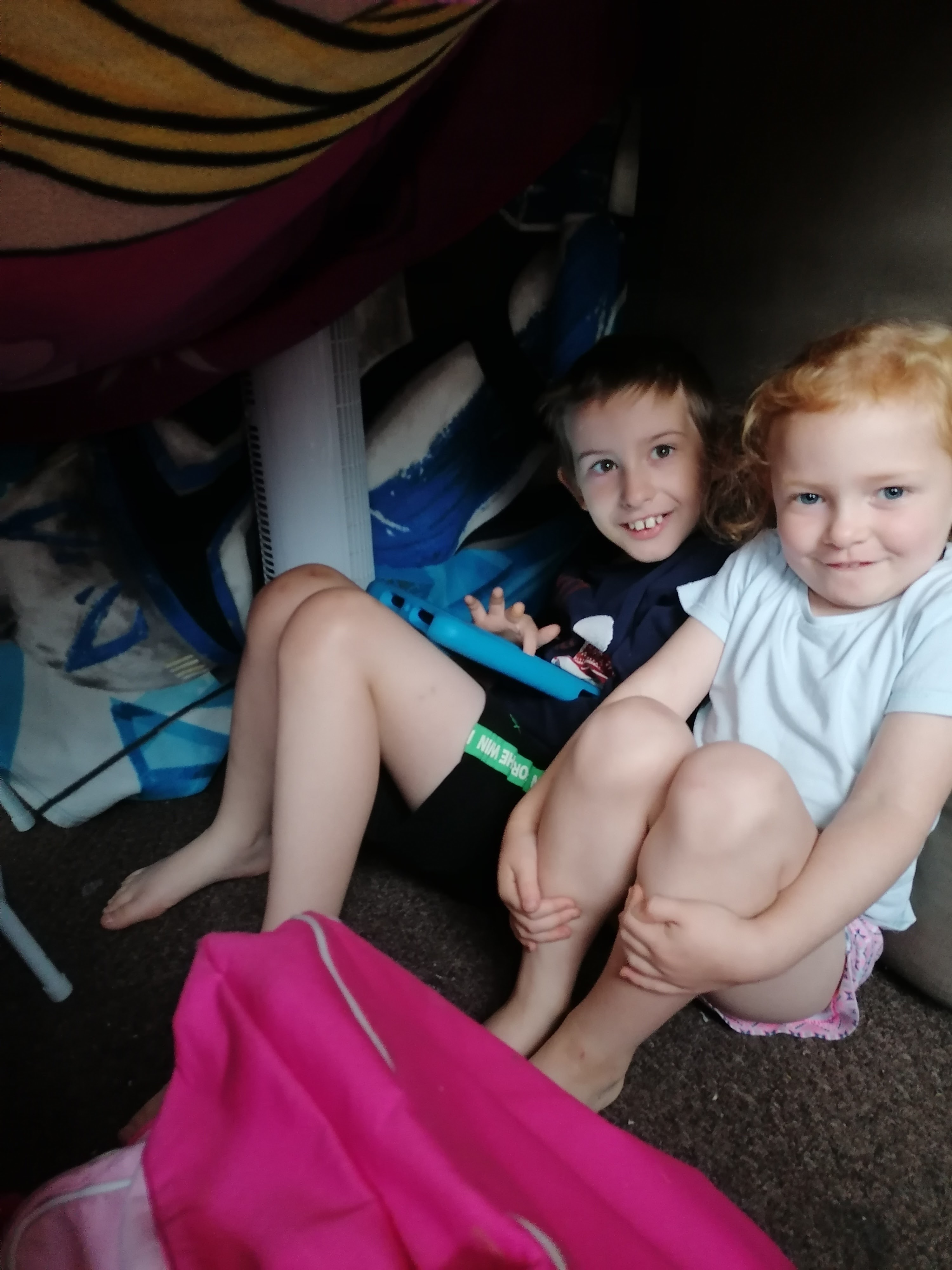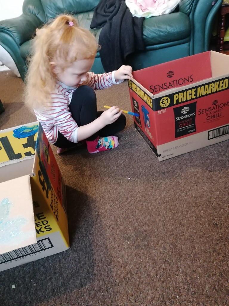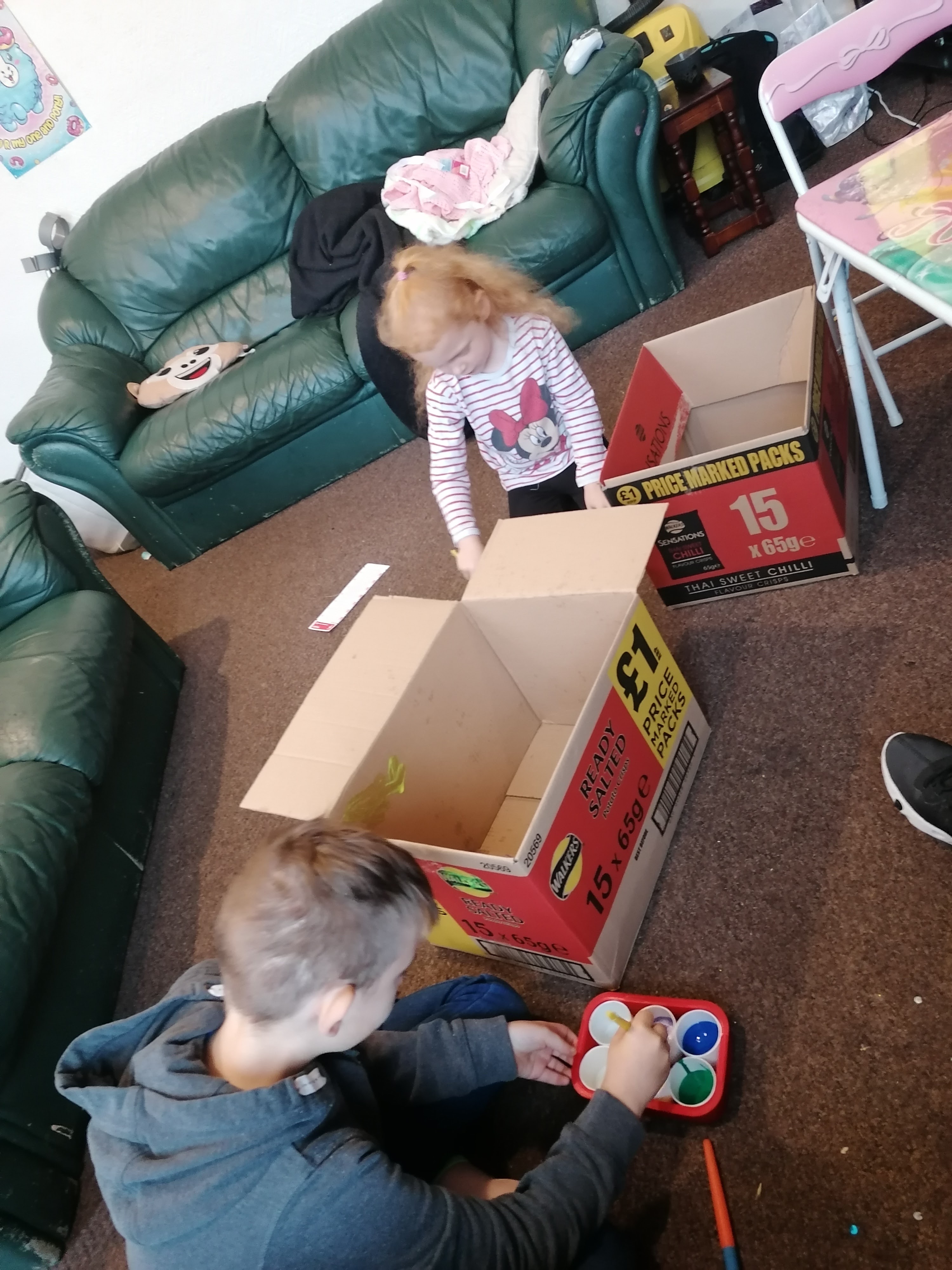 On a miserable day in July, the children decided they wanted to craft a cat bed. Each one was for Warren’s kitty, Dusty, and one for Pandora’s kitty, Afur..