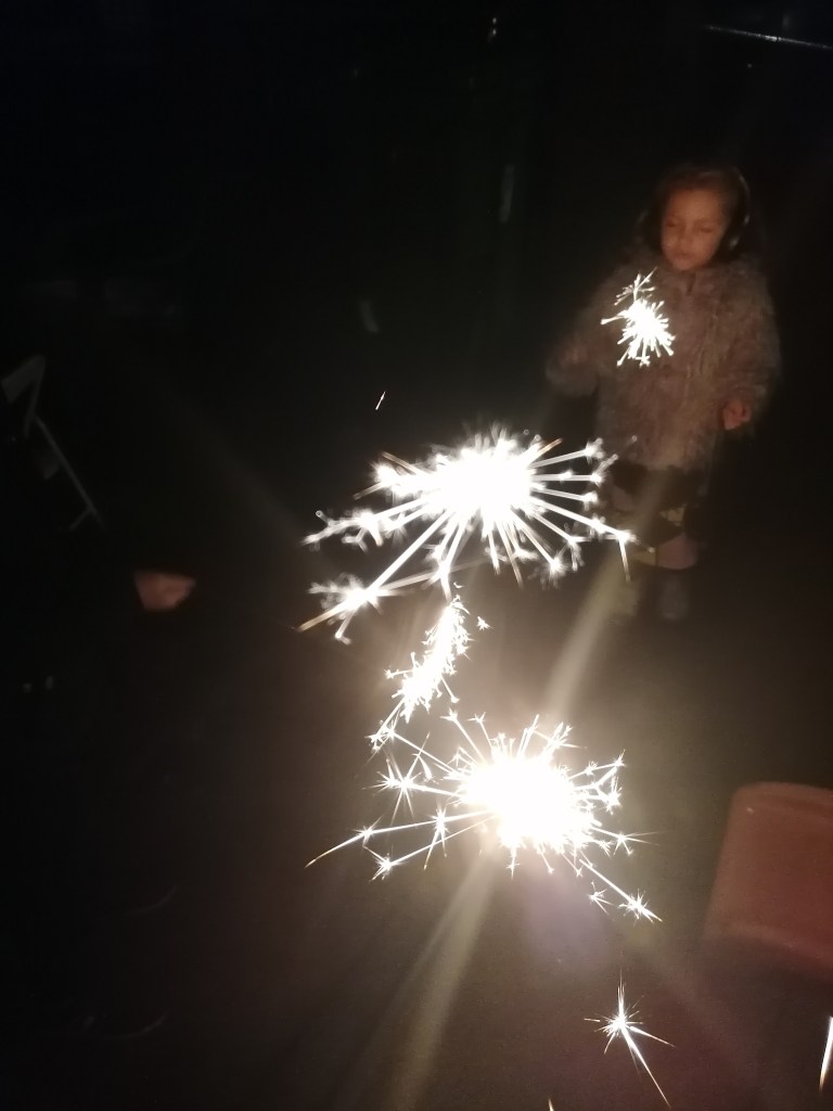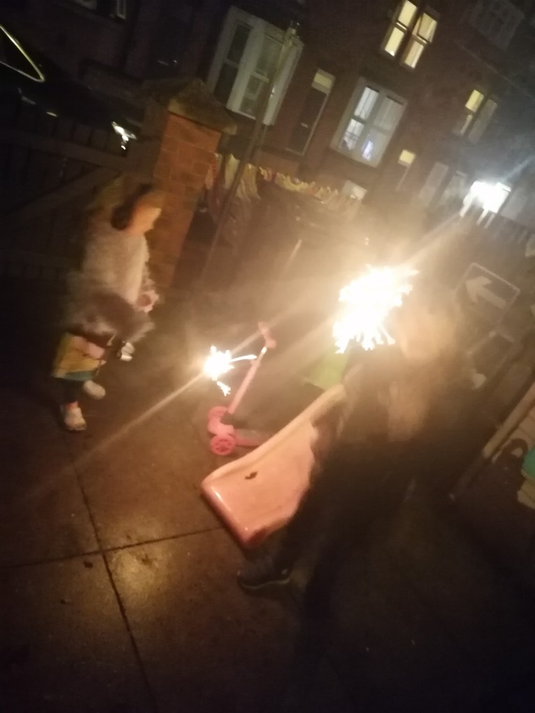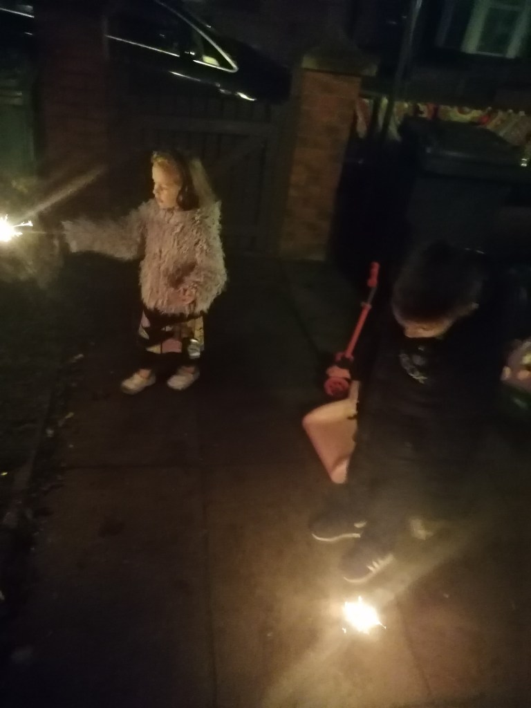 We toasted marshmallows. Had sparklers, then walked to the top of our street to watch the fire and fireworks.