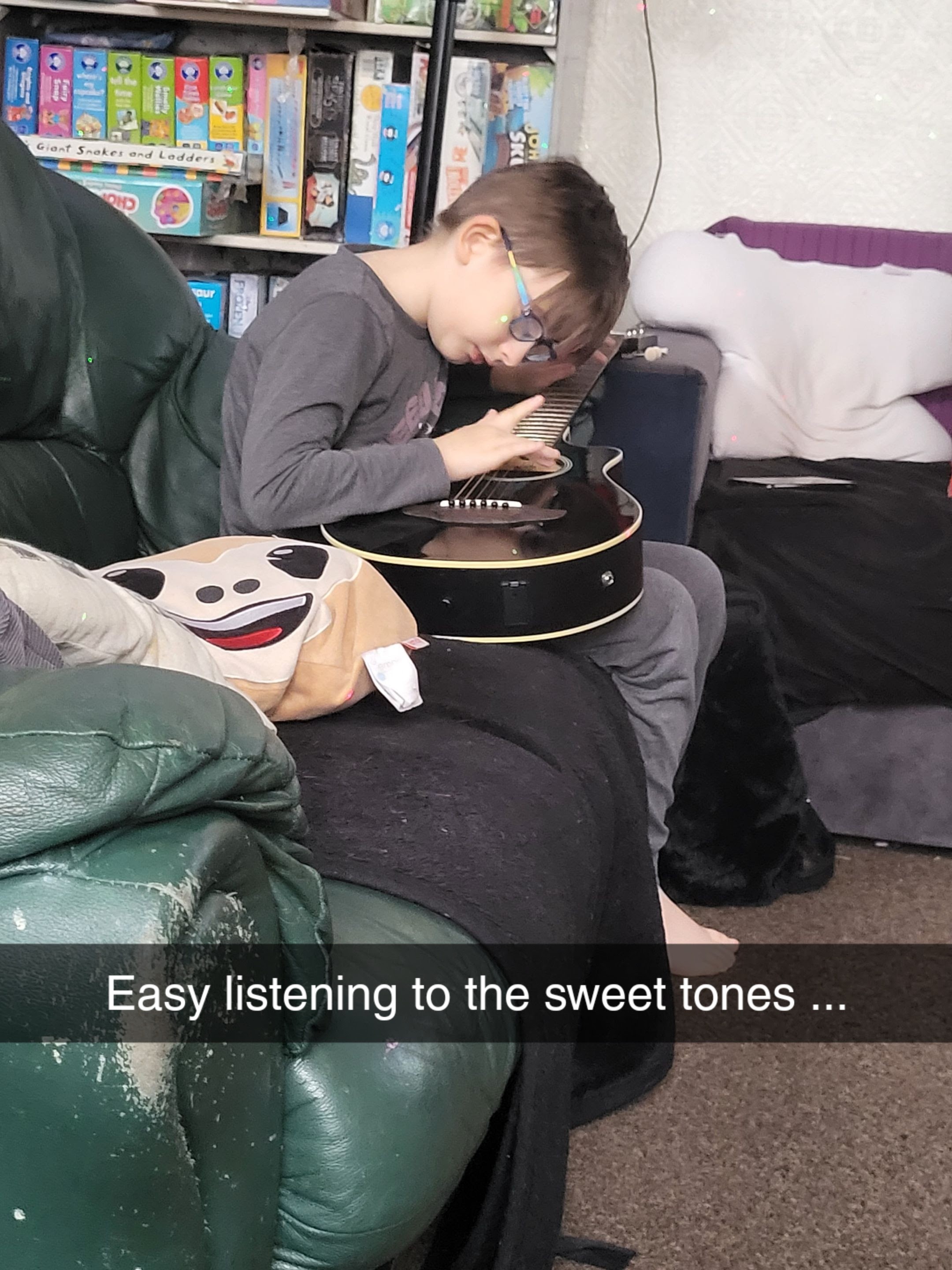 Warren with his guitar, its a good way to get kids talking about how they feel.