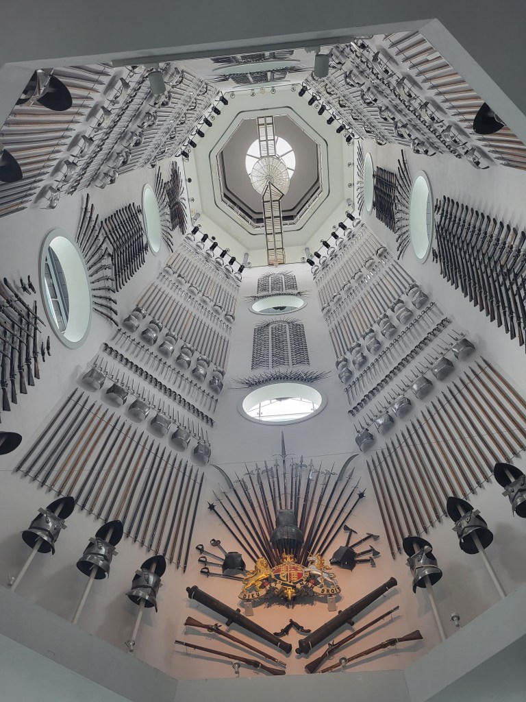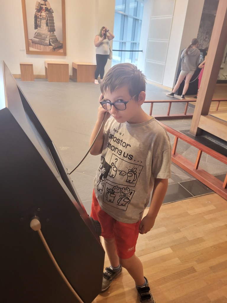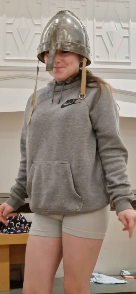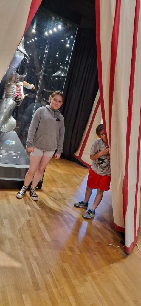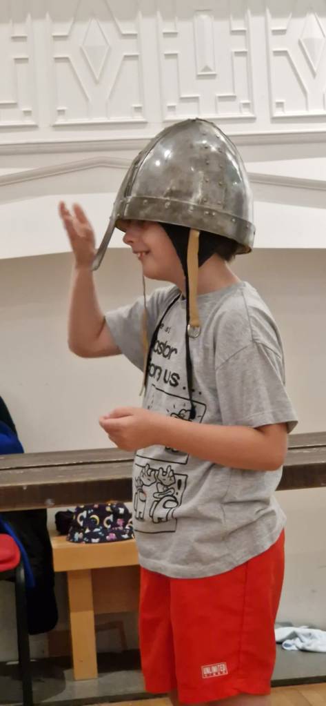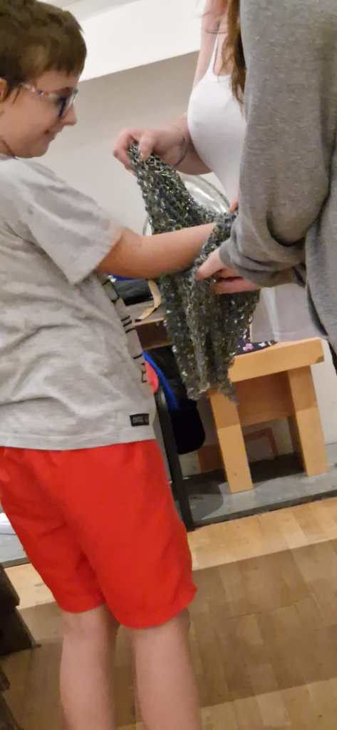 We enjoyed looking around, holding the chain, me a little more than I should. Lexii volunteered to try on some helmets. You can have a look here. And of course, Warren wanted a turn, which you can also see here.