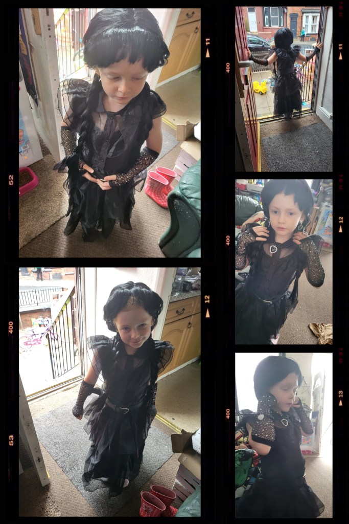 Pandora loves Wednesday Addams, so it made sense to get her this outfit for Halloween – the wig, jewelery, gloves, all of it. She loves it. short video giving us a twirl