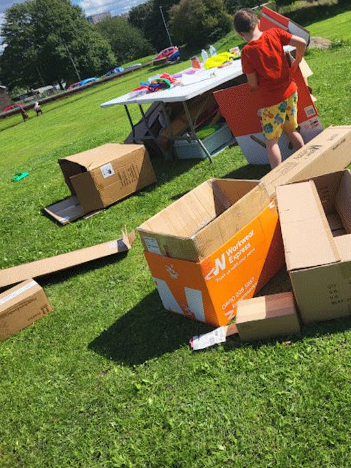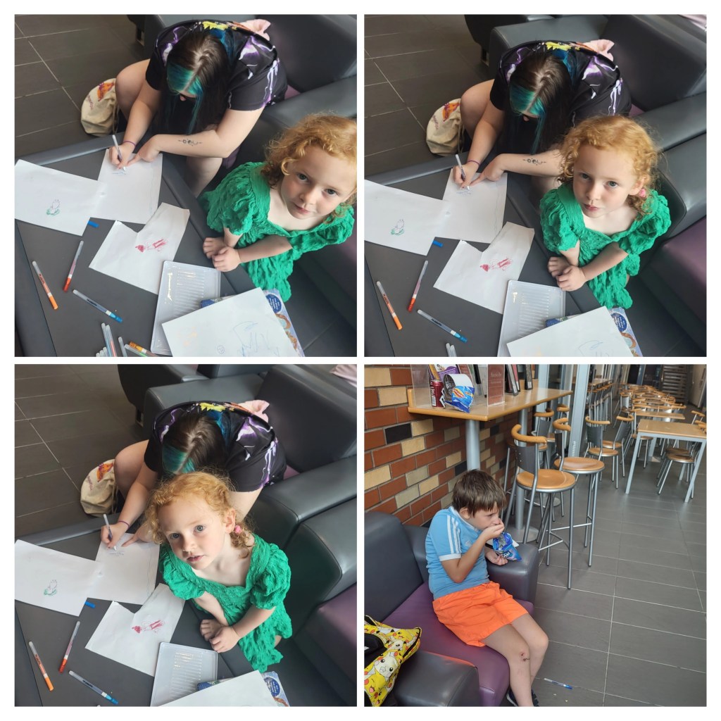 After swimming, we take a seat in the foyer. They have a small library and opportunities for drawing at Armley Leisure Centre.